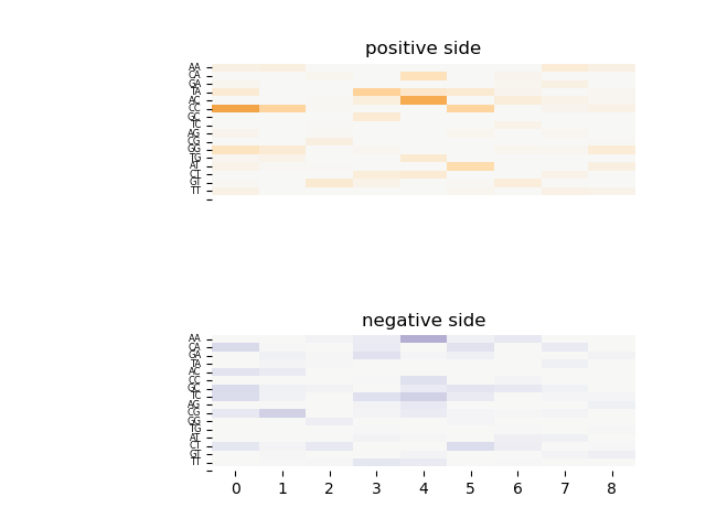 In demo2, we consider DNA structural features as a specific form of position-specific dinucleotide dependency, using the bpf shape_heatmap functionality to generate the heatmap.